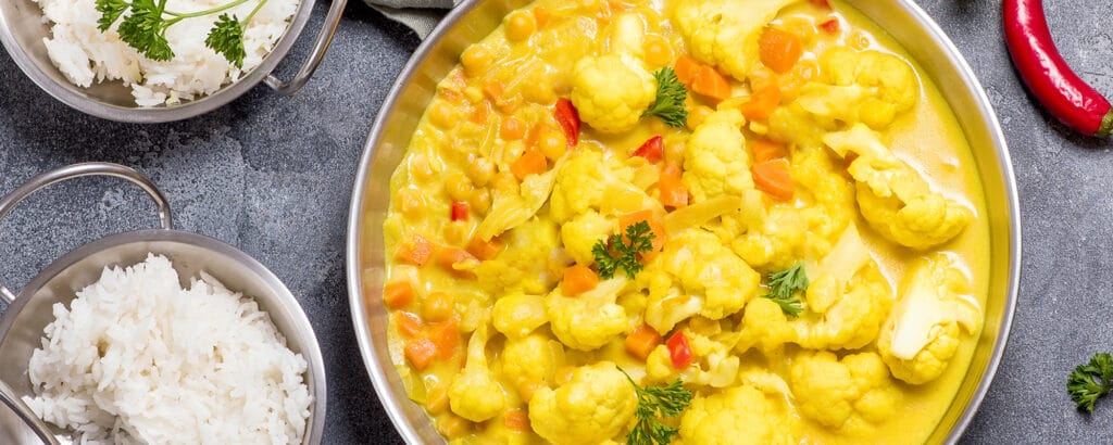 Curry de chou-fleur, dés de mangue, lentilles et grenades